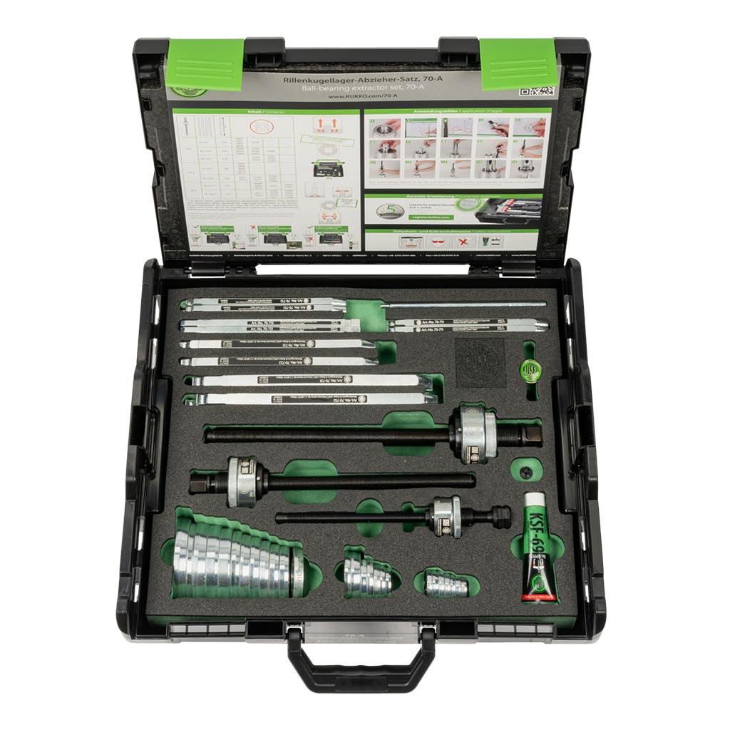 • Setul de extractoare pentru rulmenti cu bile 70-A, format din 59 de piese, este utilizat pentru extragerea nedistructiva a rulmentilor cu bile cu canelura adanca, fara demontarea arborelui, in mestesuguri, industrie si ateliere