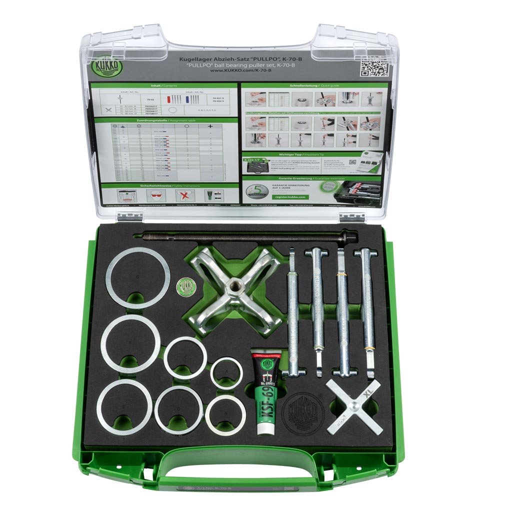• Setul de 21 extractoare pentru rulmenti cu bile „PULLPO” K-70-B este utilizat pentru extragerea complet nedistructiva a rulmentilor cu bile cu canelura adanca, fara a demonta arborele, in meserii, industrie si ateliere